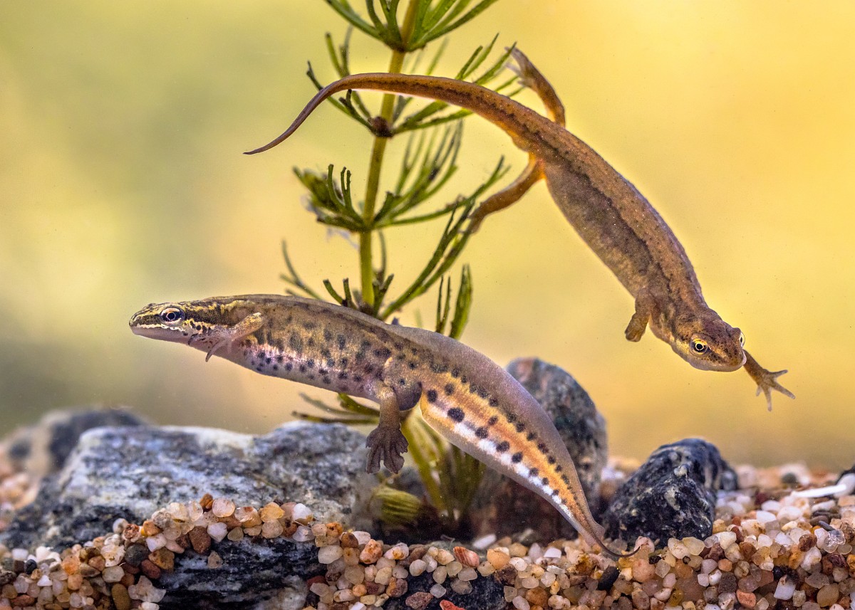 Lissotriton helveticus 14, Vinpootsalamander, Saxifraga-Rudmer Zwerver.jpgPair of Palmate newt swimming in natural aquatic habitat Palmate newt (Lissotriton helveticus) colorful aquatic amphibian pair swimming in freshwater habitat of pond. Underwater wildlife scene of animal in nature of Europe. Netherlands.