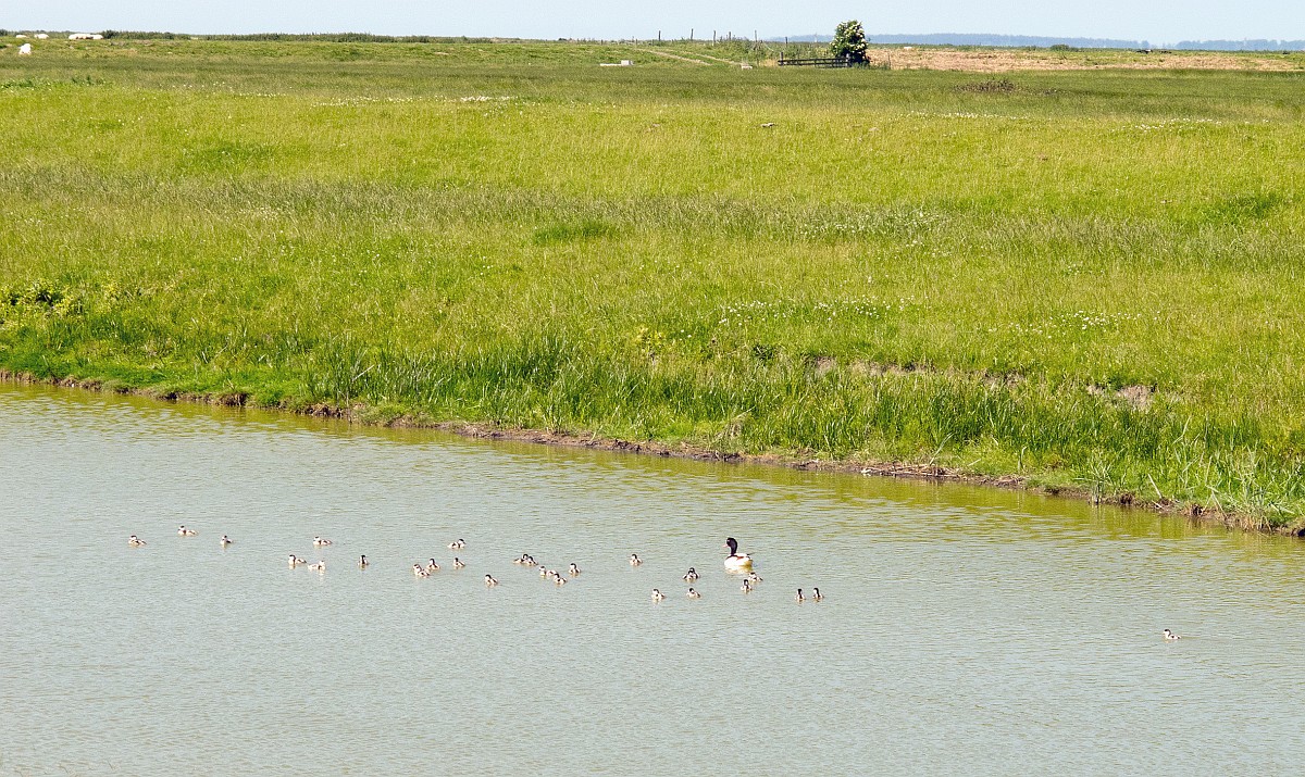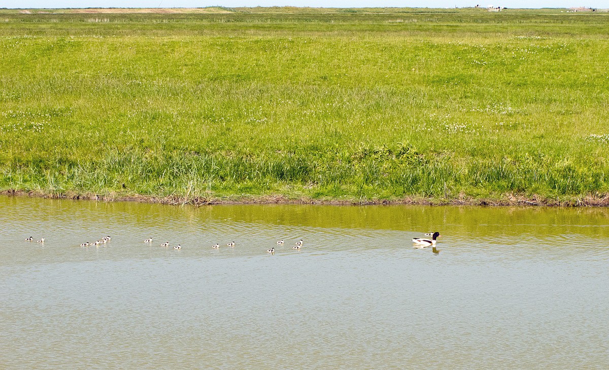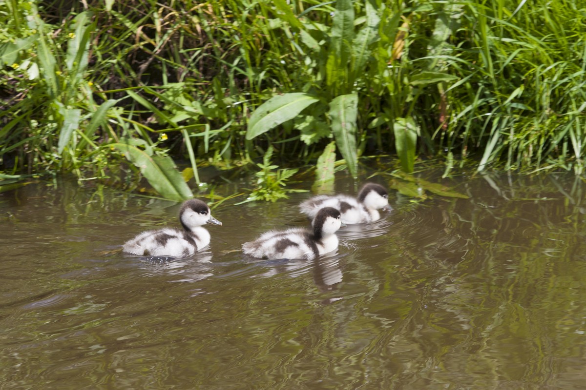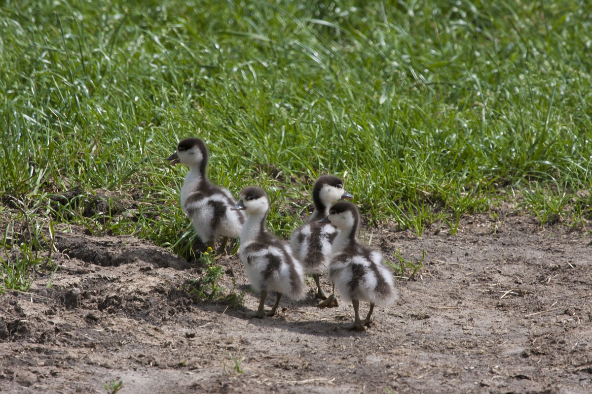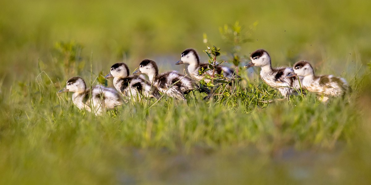 Tadorna tadorna 101, Bergeend, Saxifraga-Rudmer Zwerver.jpg Row of cute Shelduck ducklings running in a row Row of cute Shelduck ducklings running in a row through grass of wetland nature reserve