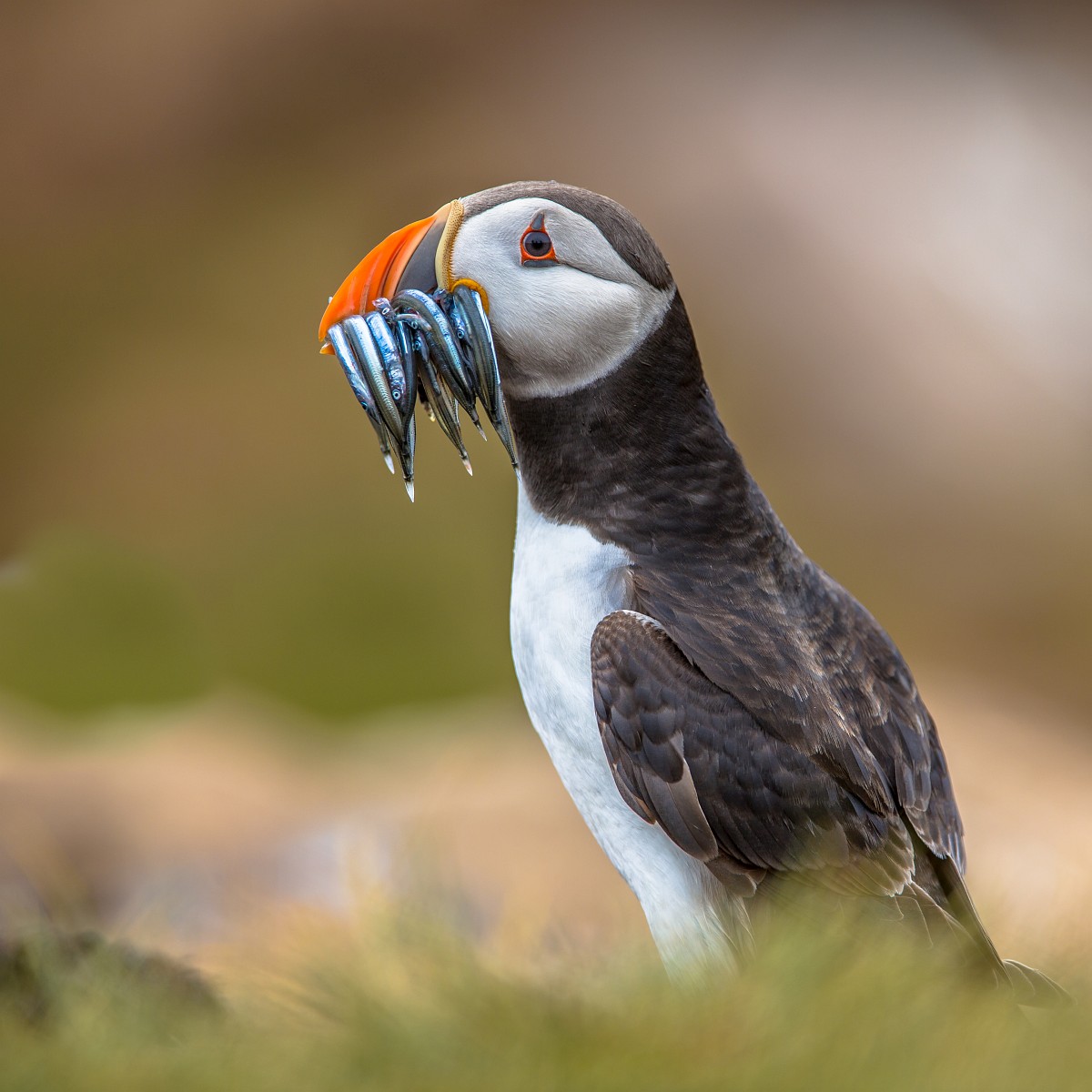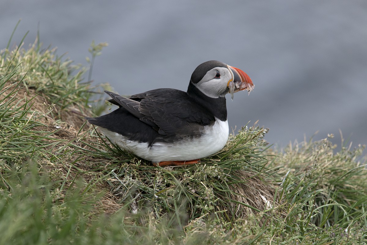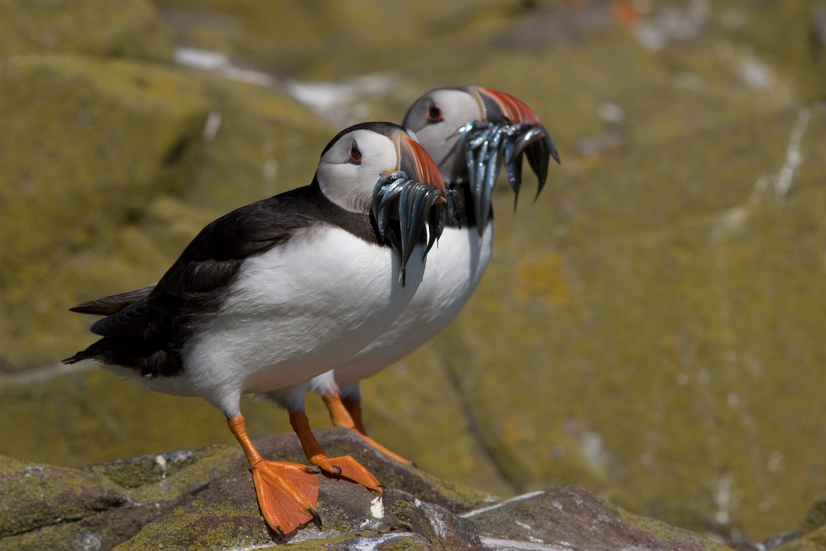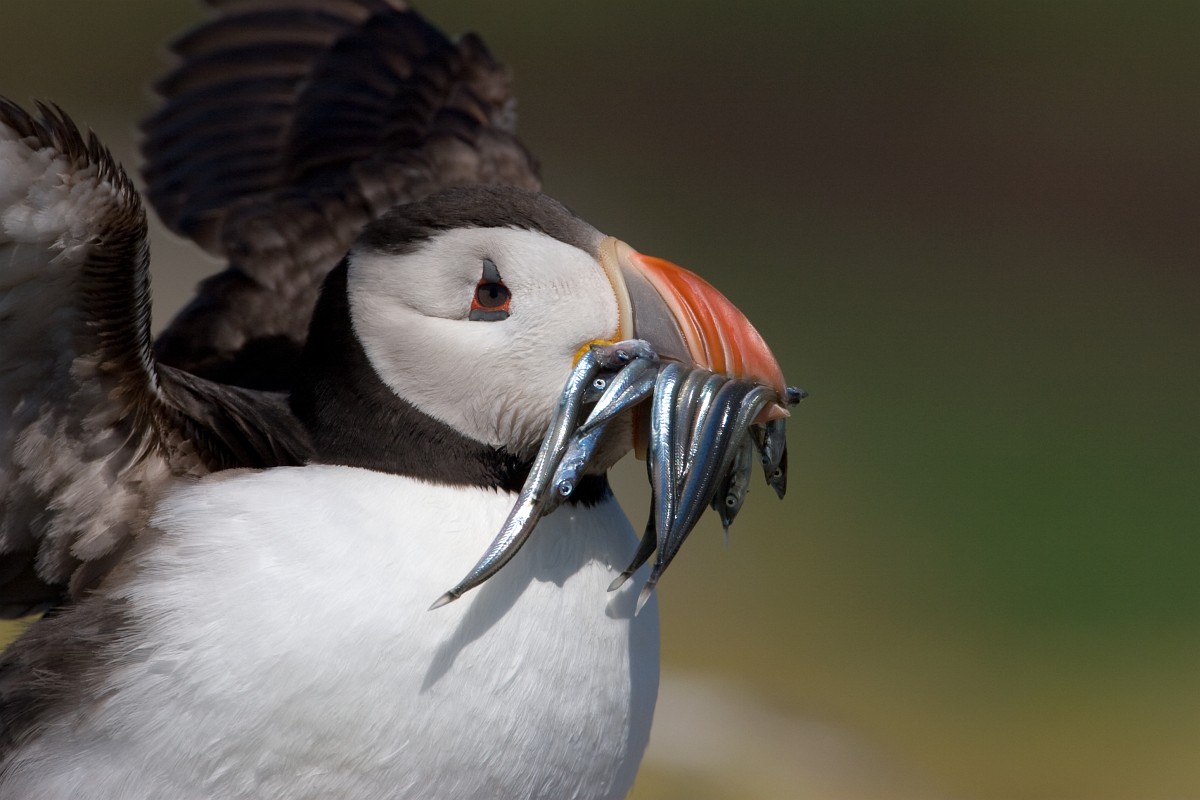 Fratercula arctica 66, Papagaaduiker, Saxifraga-Rudmer Zwerver.jpgPuffin with beak full of fish Puffin (Fratercula arctica) with beek full of sandeels on its way to nesting burrow in breeding colony