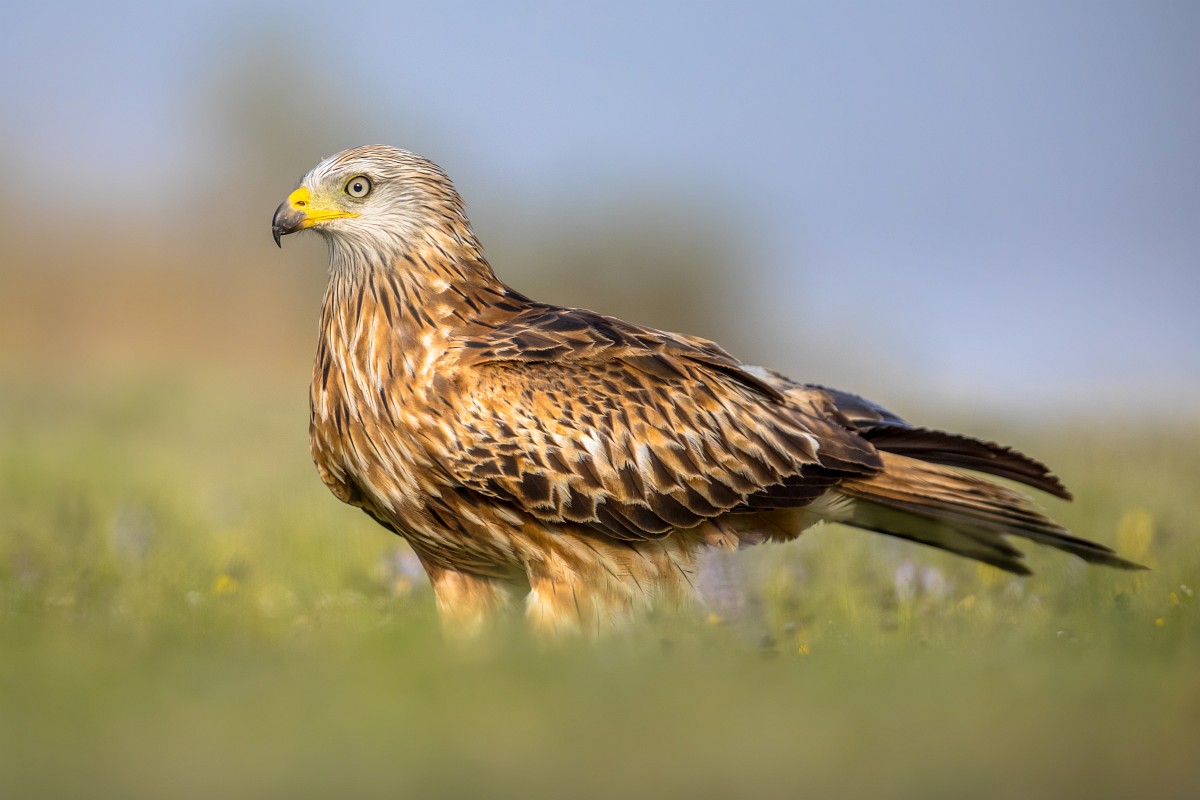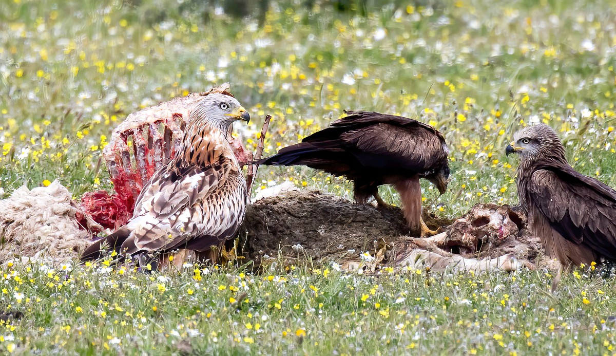Milvus milvus 144, Rode wouw, Saxifraga-Rudmer Zwerver.jpg Red kite perched in green grass with flowers Red kite (Milvus milvus) perched in Spanish Pyrenees, Vilagrassa, Catalonia, Spain. April. It is resident in the milder parts of its range in western Europe and northwest Africa, birds from northeastern and central Europe winter further south and west.
