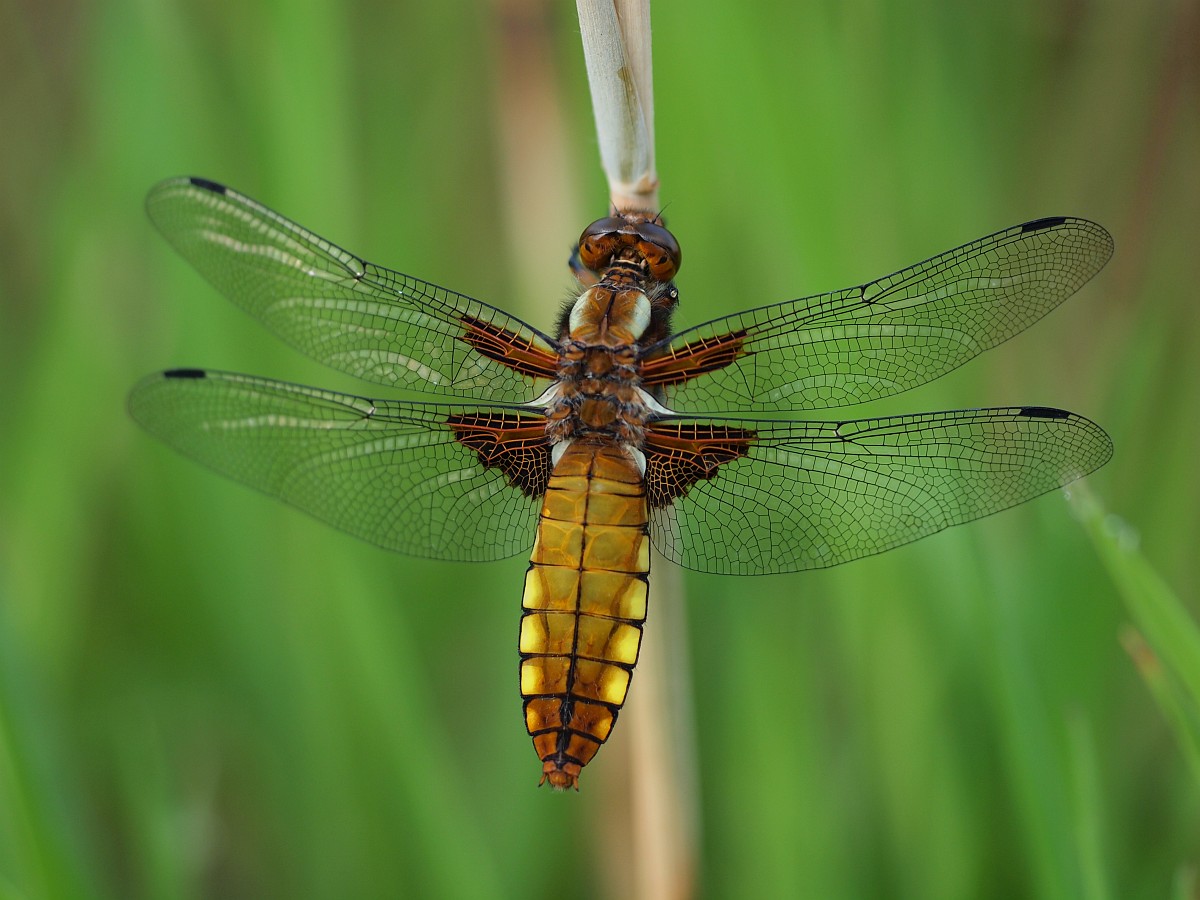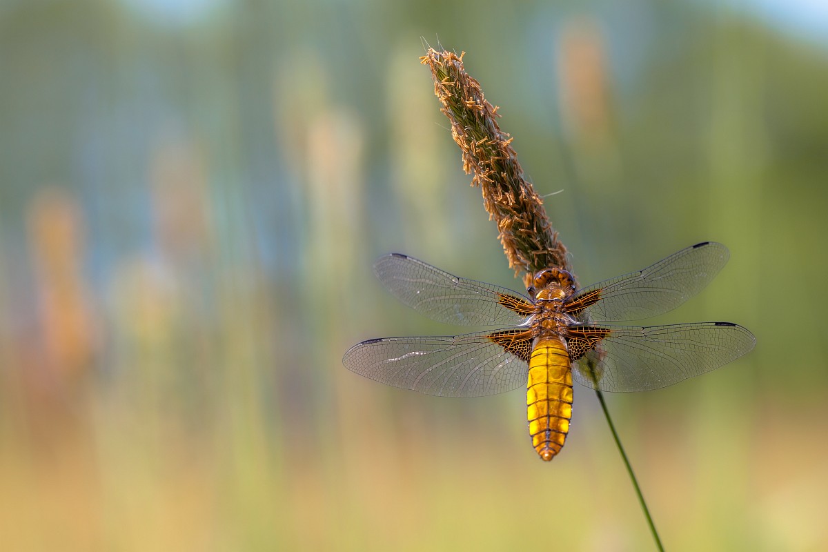 Libellula depressa 21, Platbuik, Saxifraga-Rudmer Zwerver.jpg Female Broad-bodied Chaser Dragonfly Female Broad-bodied Chaser Dragonfly (Libellula depressa) perched on Grass Ear in the Sun |