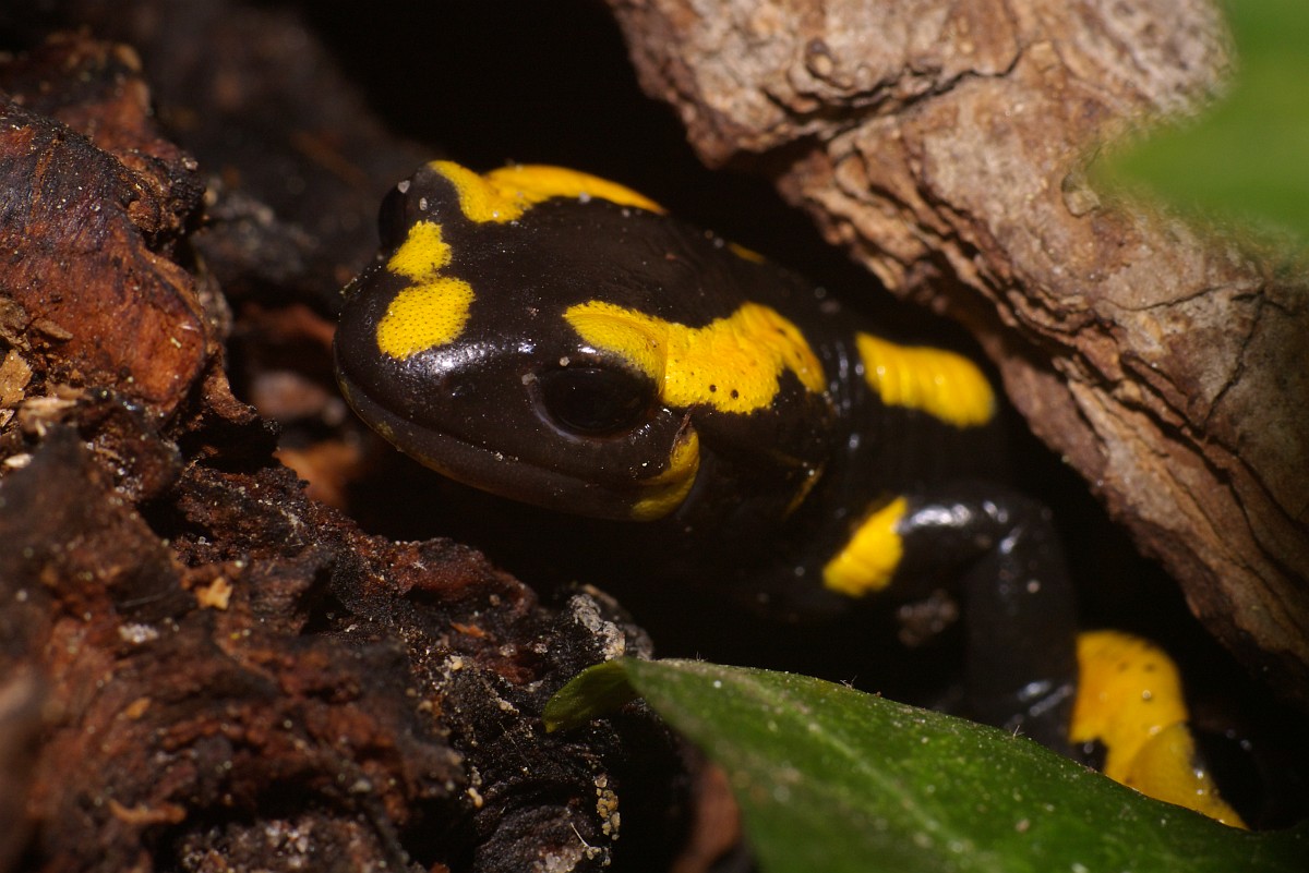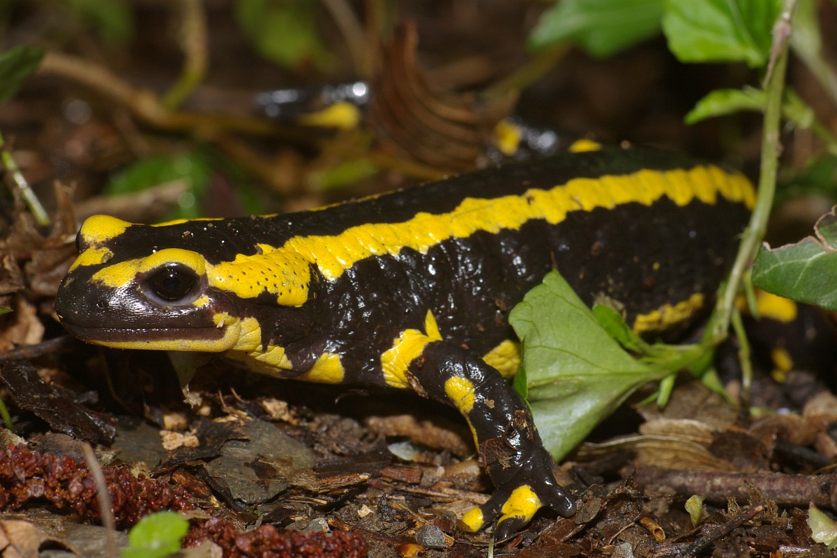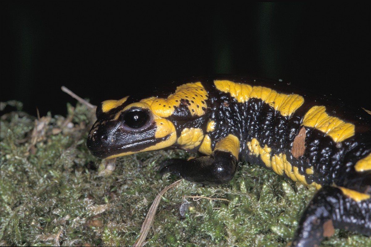 Salamandra salamandra 44, Vuursalamander, Saxifraga-Rudmer Zwerver.jpgClose up of Fire salamander newt in its natural habitat Fire salamander newt (Salamandre salamandre) live in central European deciduous forests and are declining amphibians in numbers
