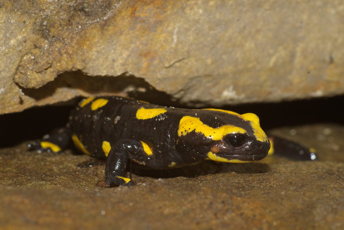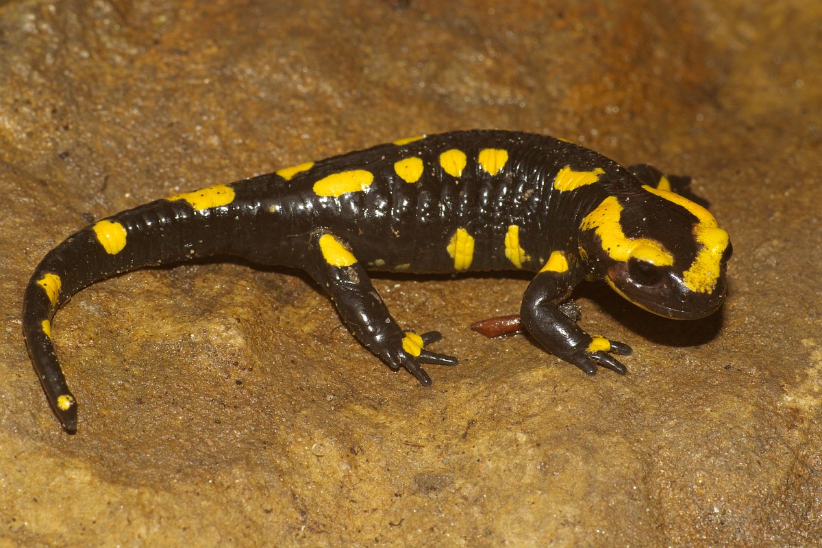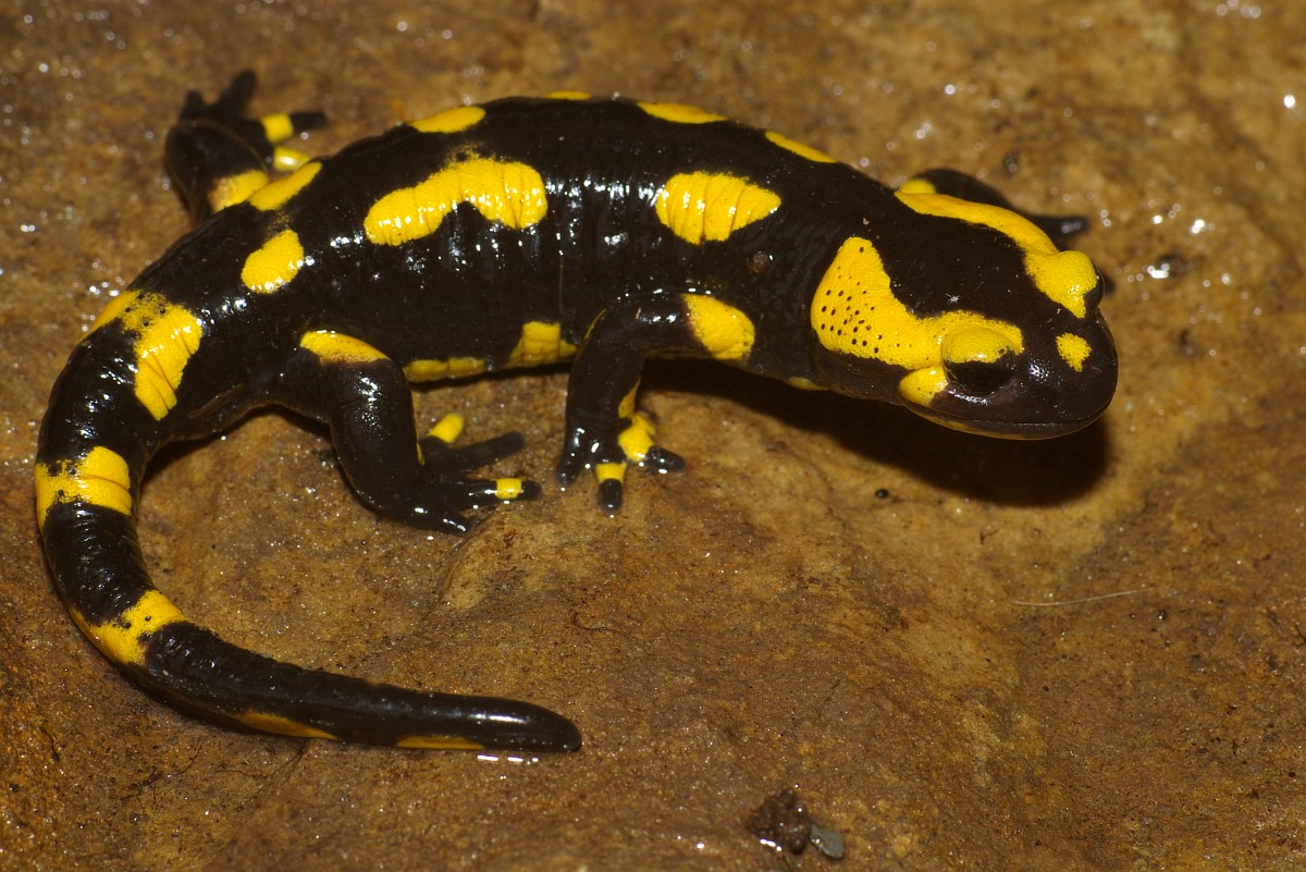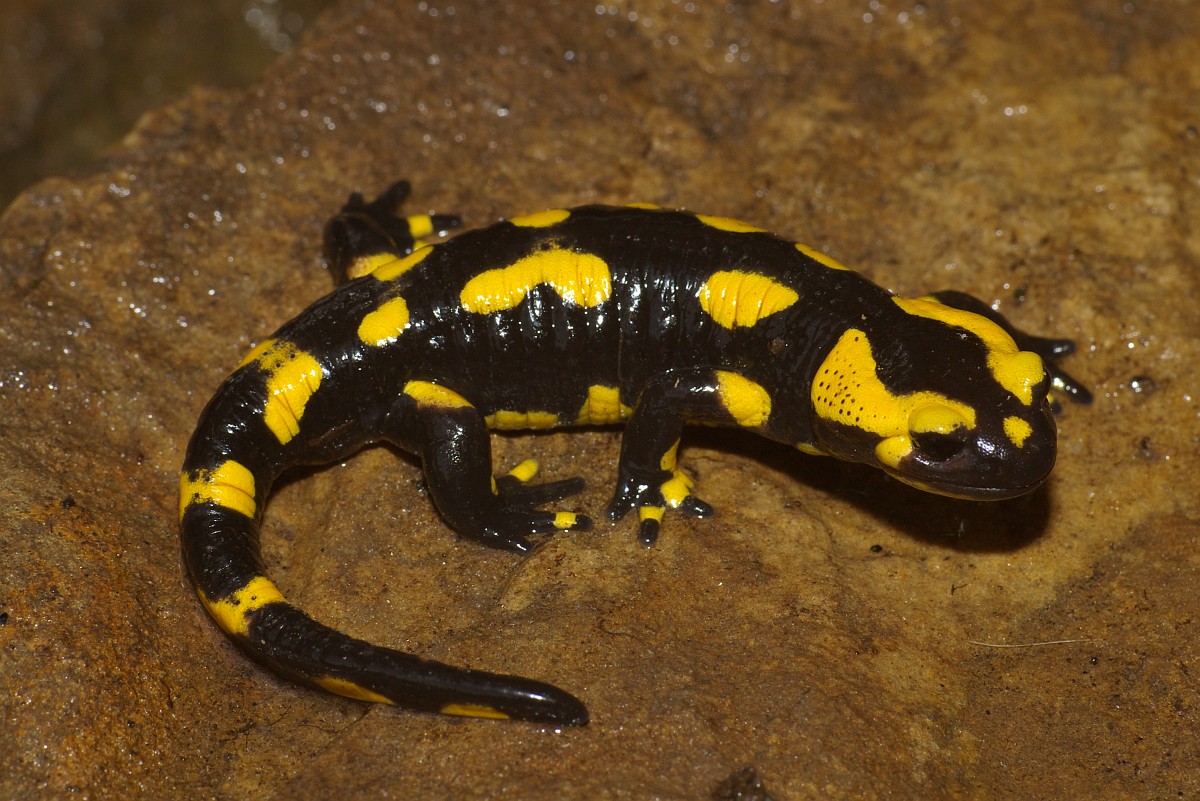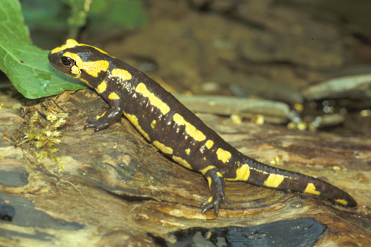 Salamandra salamandra 45, Vuursalamander, Saxifraga-Rudmer Zwerver.jpgFire salamander along forest stream Fire salamander (Salamandra salamandra) in natural habitat along small stream in deciduous forest on peloponnese peninsula in Greece