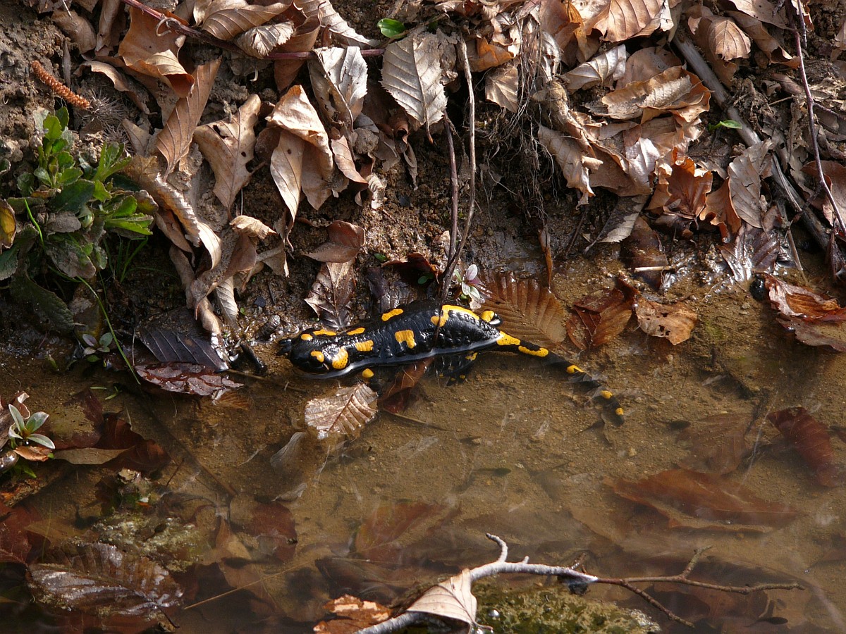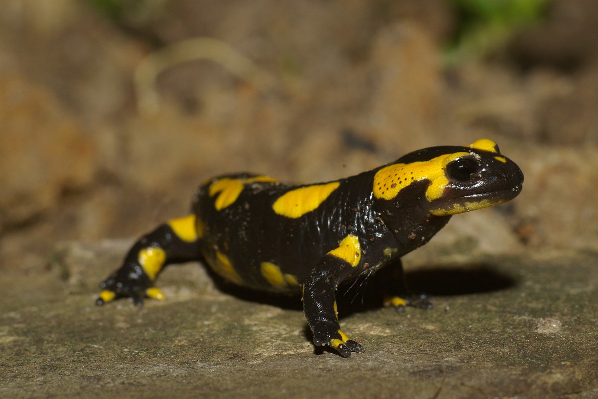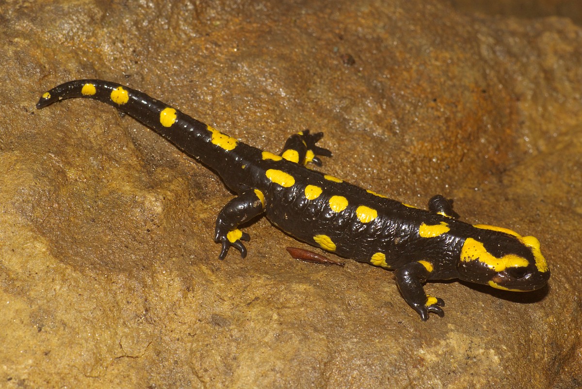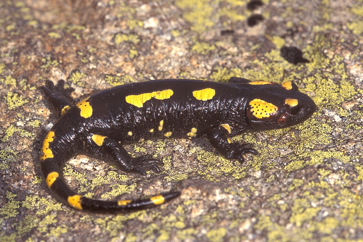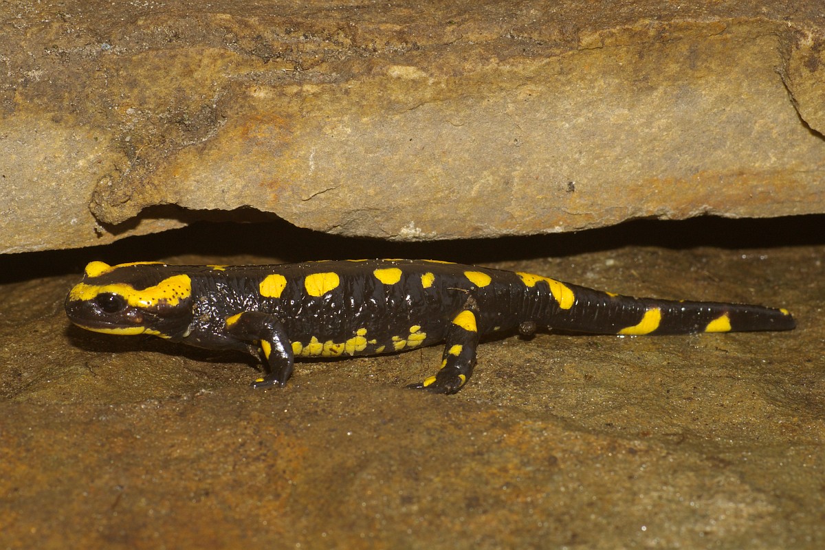 Salamandra salamandra 45, Vuursalamander, Saxifraga-Rudmer Zwerver.jpgFire salamander along forest stream Fire salamander (Salamandra salamandra) in natural habitat along small stream in deciduous forest on peloponnese peninsula in Greece
