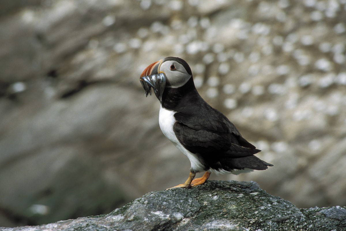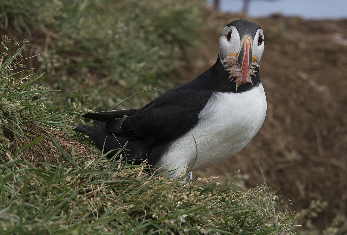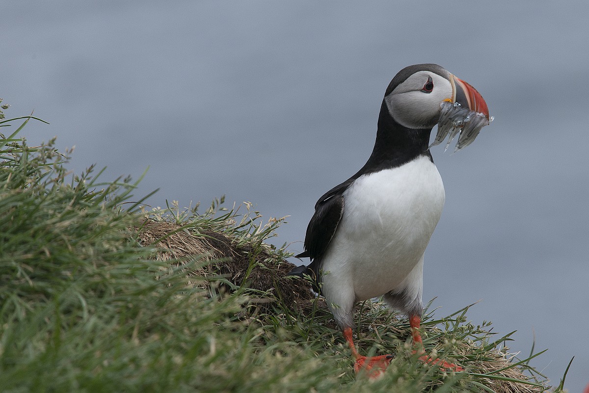 Fratercula arctica 66, Papagaaduiker, Saxifraga-Rudmer Zwerver.jpgPuffin with beak full of fish Puffin (Fratercula arctica) with beek full of sandeels on its way to nesting burrow in breeding colony
