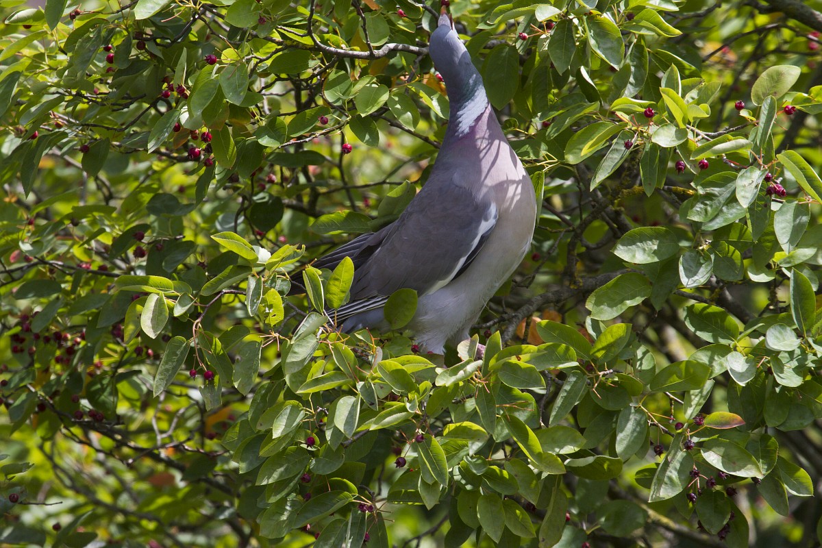 Columba palumbus 33, Houtduif, Saxifraga-Rudmer Zwerver.jpg Wood pigeon feeding on berries Wood pigeon (Columba palumbus) feeding on berries. Many resident birds forage on berry trees to survive winter.