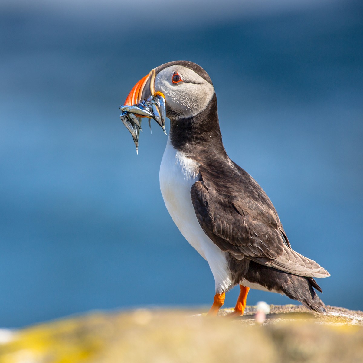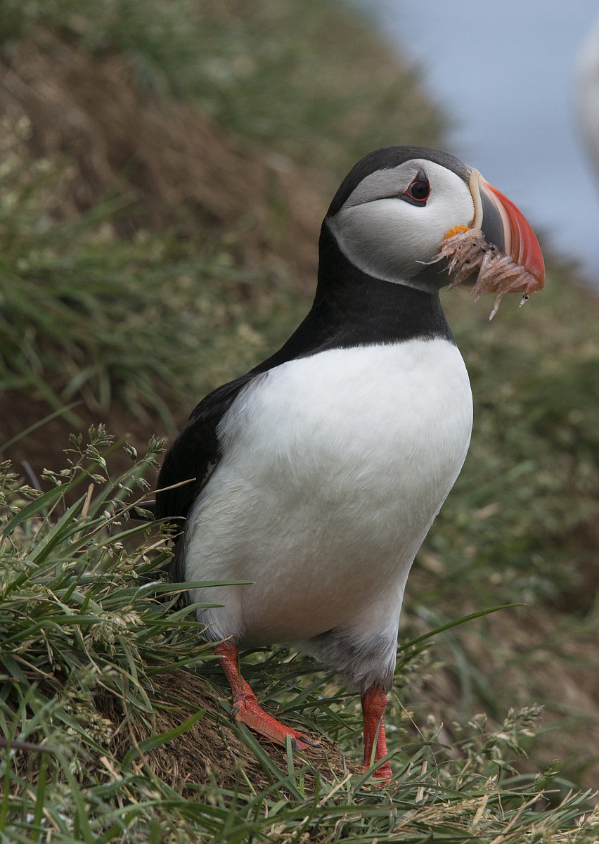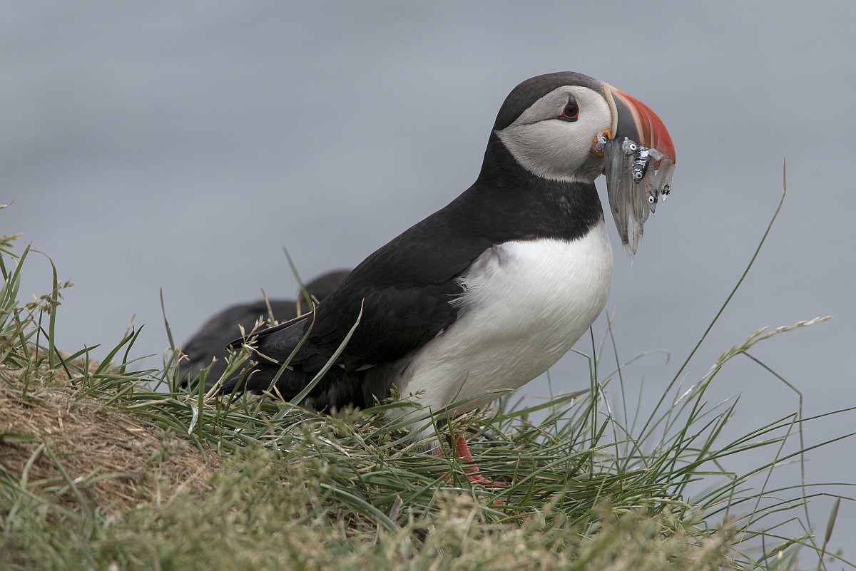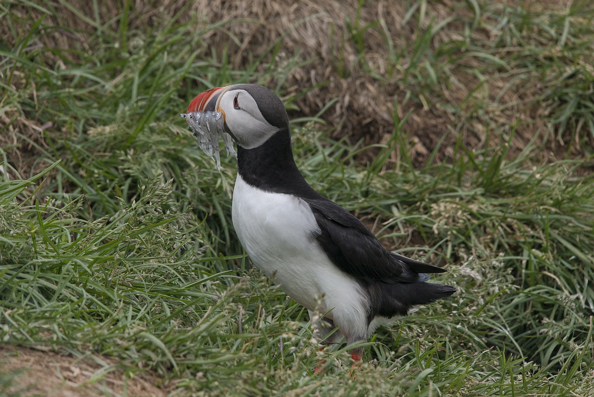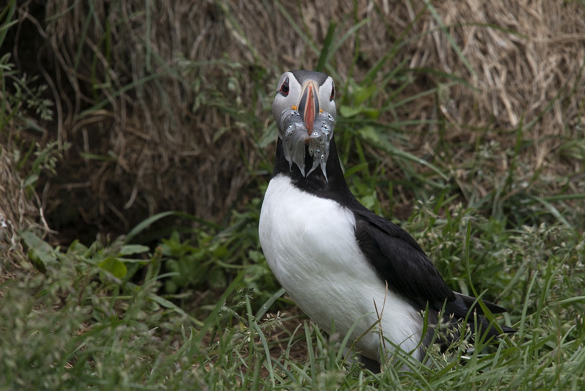 Fratercula arctica 66, Papagaaduiker, Saxifraga-Rudmer Zwerver.jpgPuffin with beak full of fish Puffin (Fratercula arctica) with beek full of sandeels on its way to nesting burrow in breeding colony