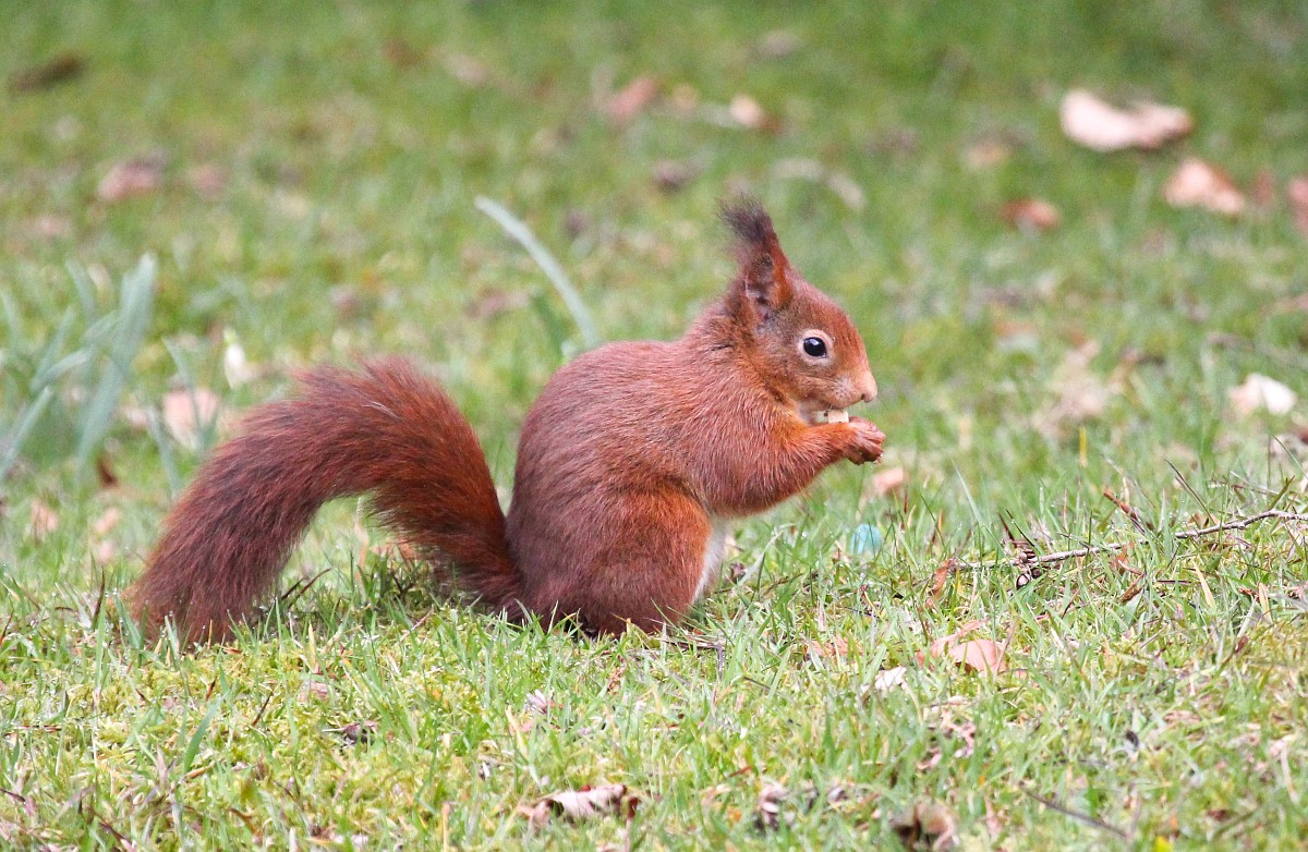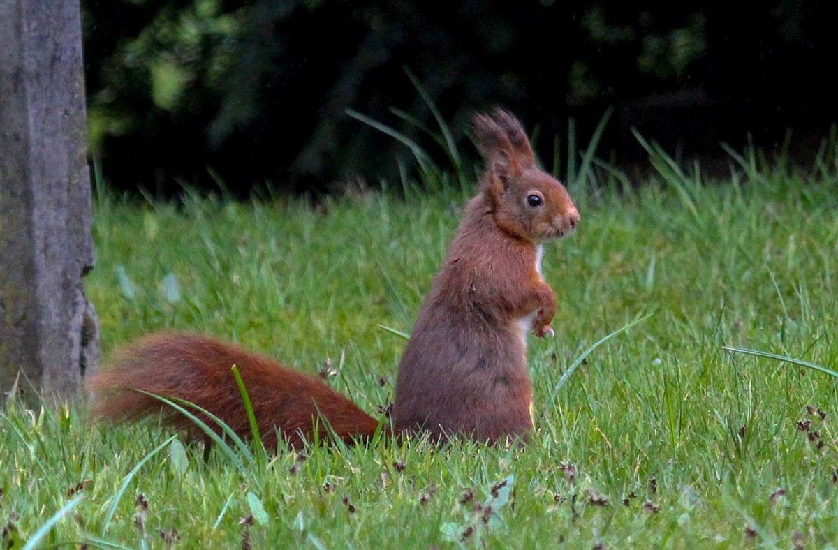 Sciurus vulgaris 201, Eekhoorn, Saxifraga-Rudmer Zwerver.jpgRed squirrel in lawn Red Squirrel (Sciurus vulgaris) standing upright in grass of backyard lawn and looking at camera