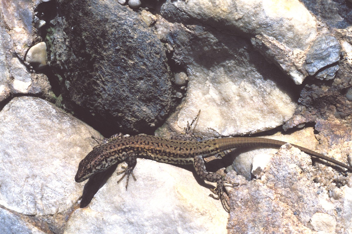 Podarcis muralis 108, Muurhagedis, Saxifraga-Rudmer Zwerver.jpgDark common wall lizard Italian common wall lizard (Podarcis muralis) dark version on a stone wall in Tuscany, Italy, April.