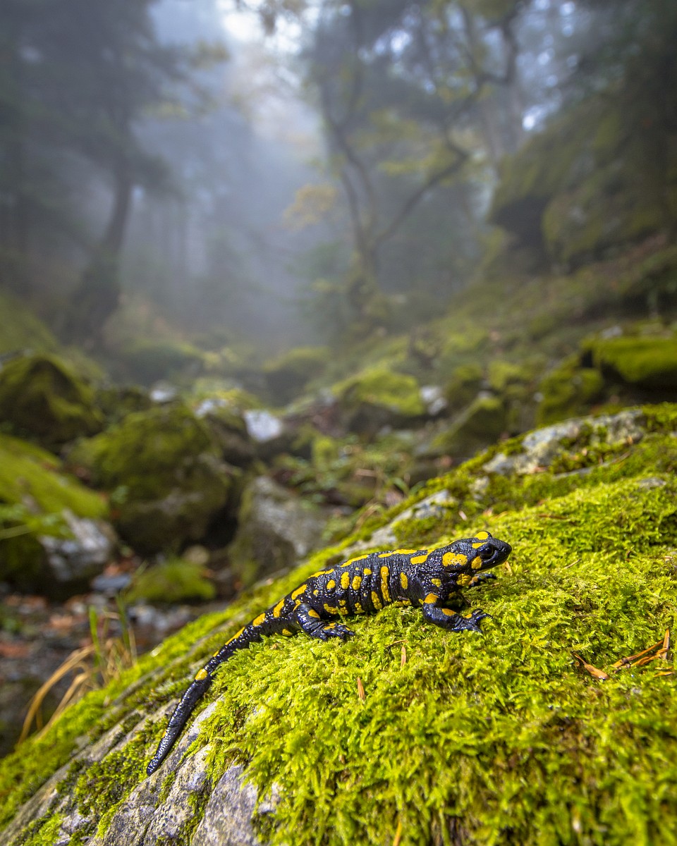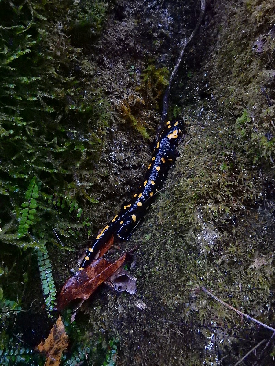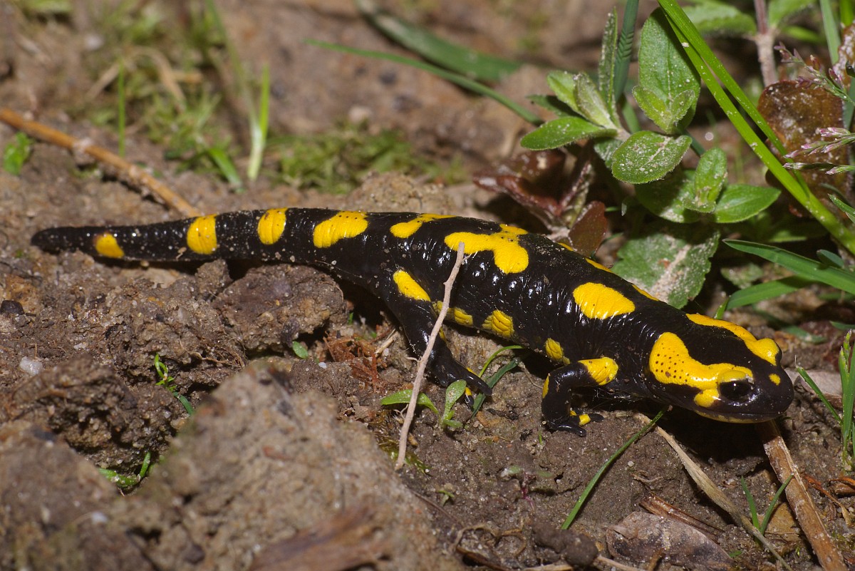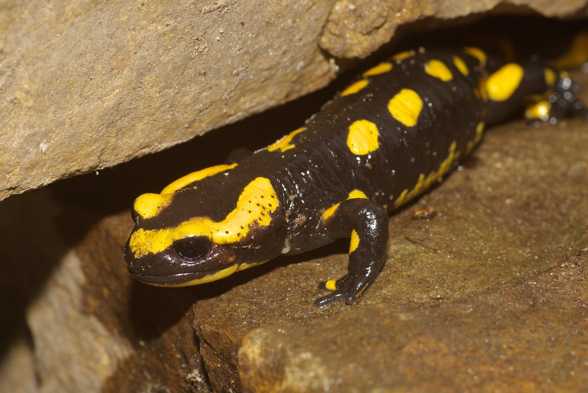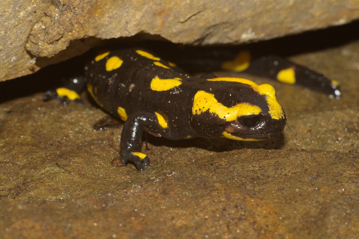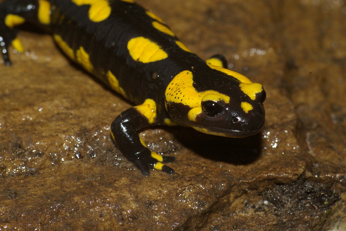 Salamandra salamandra 45, Vuursalamander, Saxifraga-Rudmer Zwerver.jpgFire salamander along forest stream Fire salamander (Salamandra salamandra) in natural habitat along small stream in deciduous forest on peloponnese peninsula in Greece