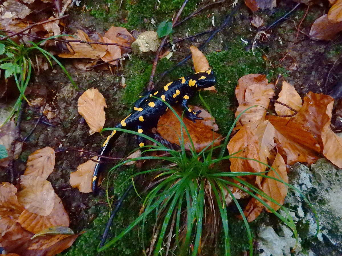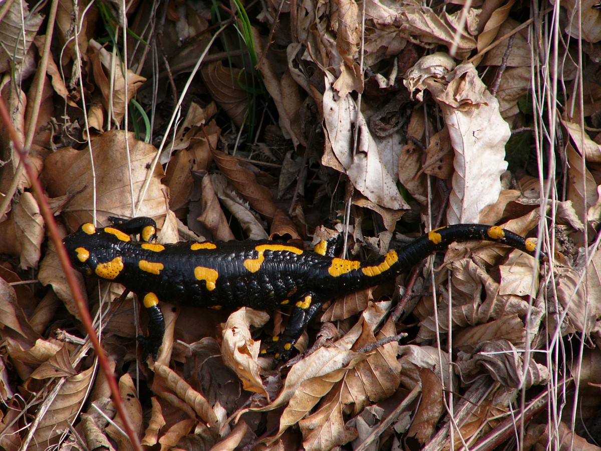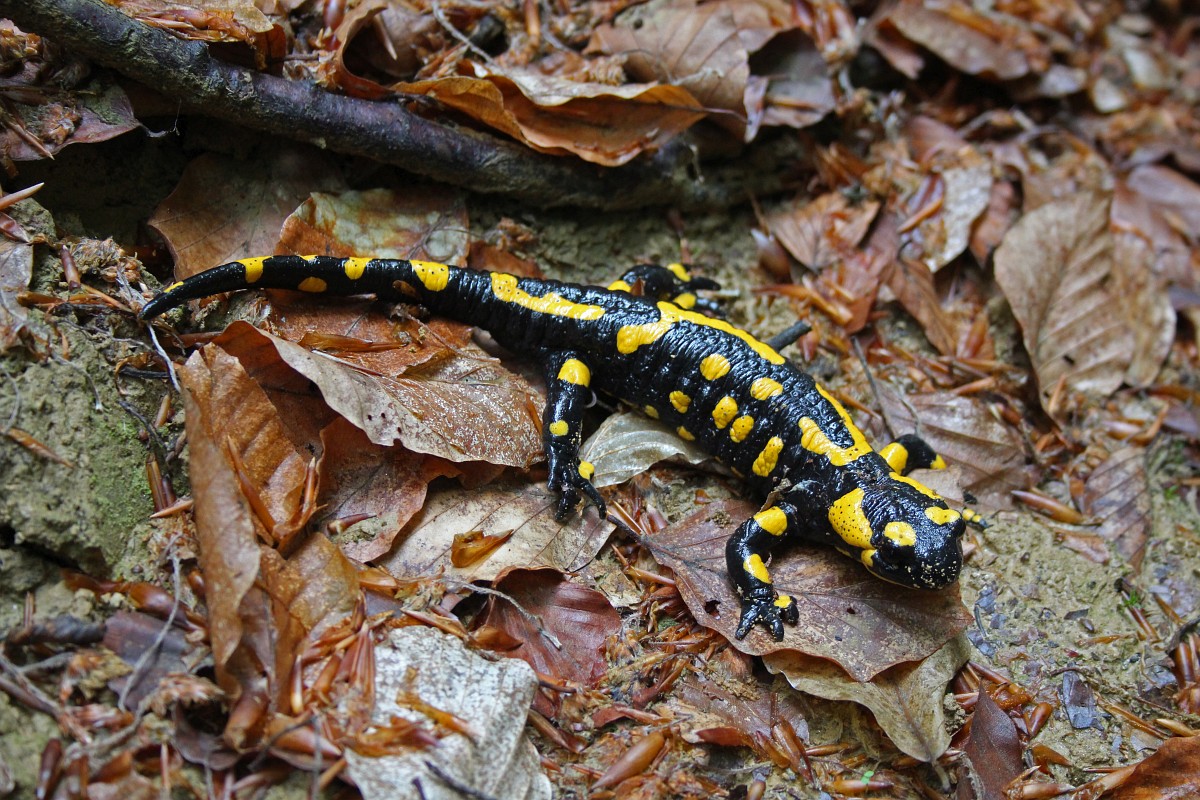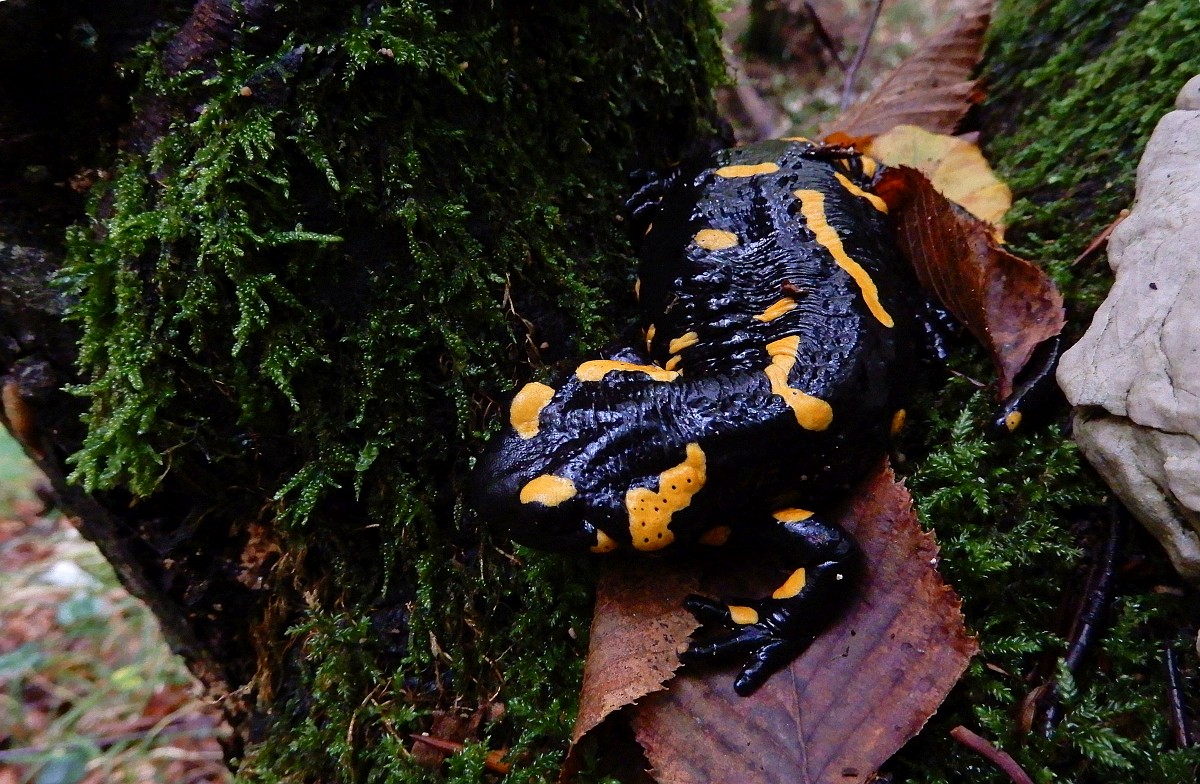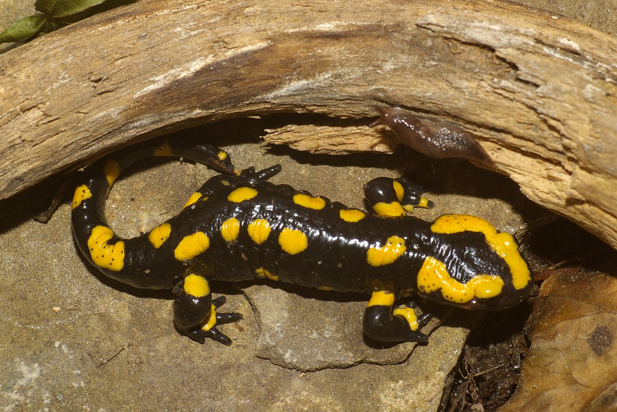 Salamandra salamandra 46, Vuursalamander, Saxifraga-Rudmer Zwerver.jpgPoisonous Fire salamander in its natural habitat Toxic Fire salamanders (Salamandre salamandre) live in central European old deciduous forests and are more common in hilly areas with lots of dead trunks.