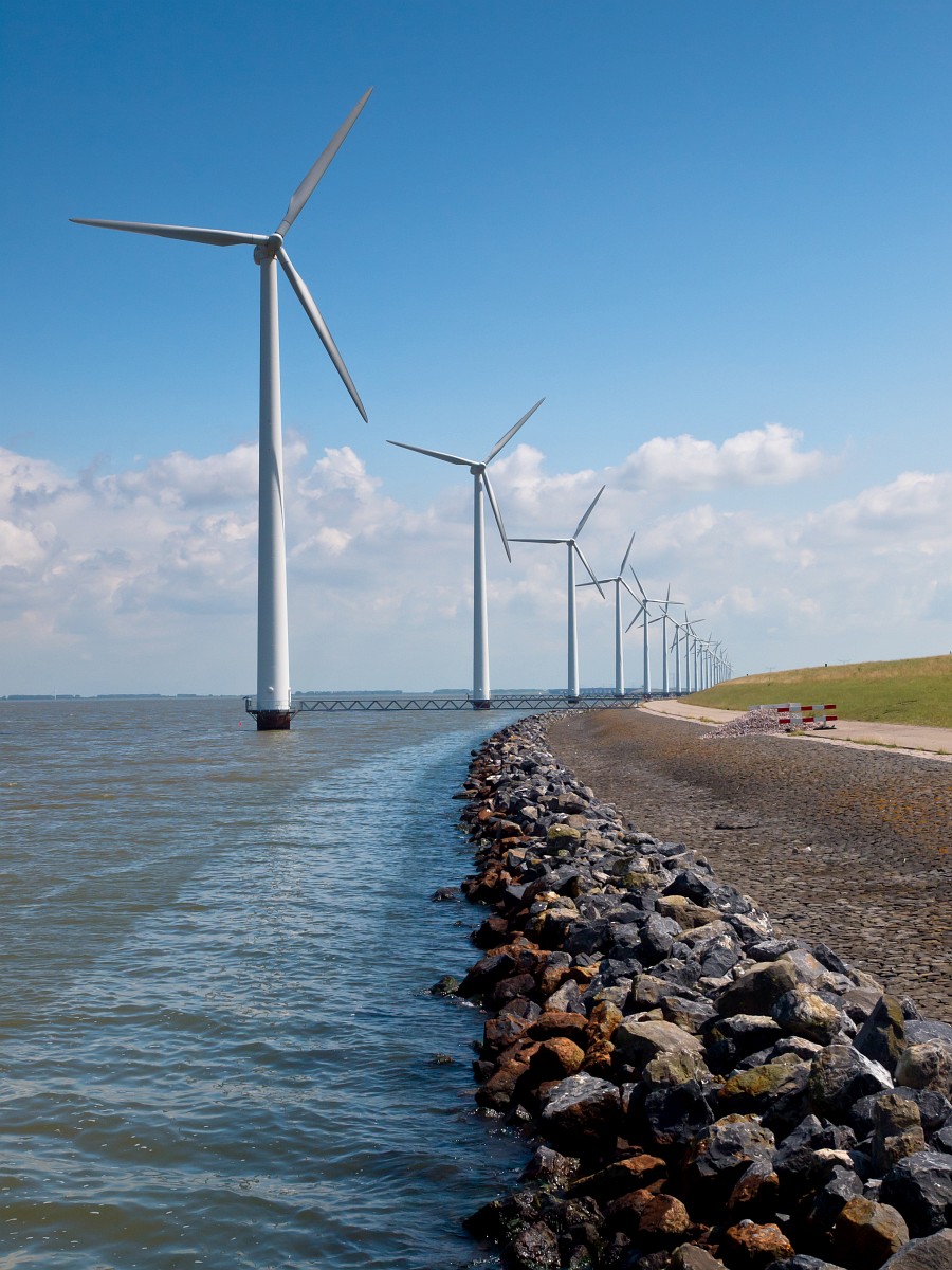 NL, Flevoland, Dronten, IJsselmeer 1, Saxifraga-Rudmer Zwerver.jpg Row of wind turbines along the coast Row of wind turbines along the coast |